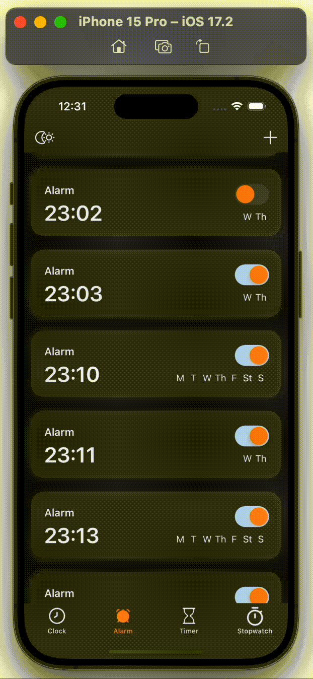 - alarm.isEnabled가 true면 repeatDays 배열을 순회하며, 각 요일에 대해 UNCalendarNotificationTrigger 생성 후 UNNotificationRequest생성하여 notificationCenter에 추가, 반복 요일에 대해 알람 설정