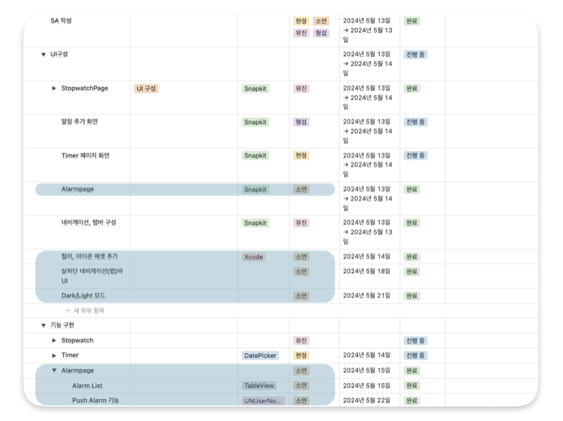 그리고 역할 분담은 총 4명의 팀원들이 탭 별로 한 페이지 씩 분담해서 구현하기로 했는데, 나는 두 번째 탭 페이지인 알람 리스트 페이지와 알람 Push Alarm 등을 구현하게 되었다.